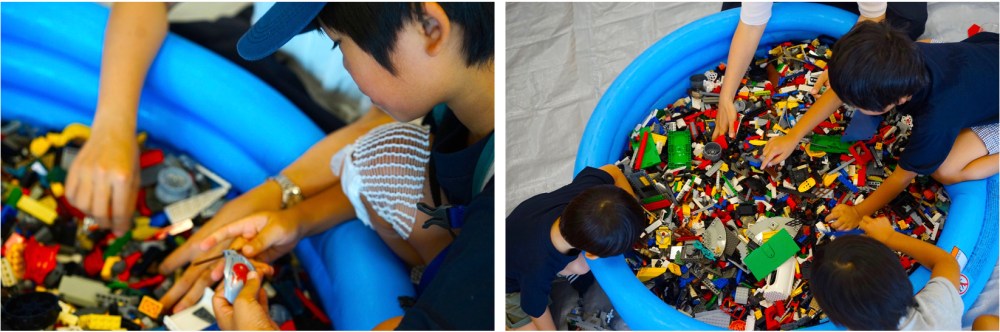 子供用プールいっぱいに詰まったレゴを自由につかって、思い思いのものを作ろう。いつ来て、いつ帰っても大丈夫です。